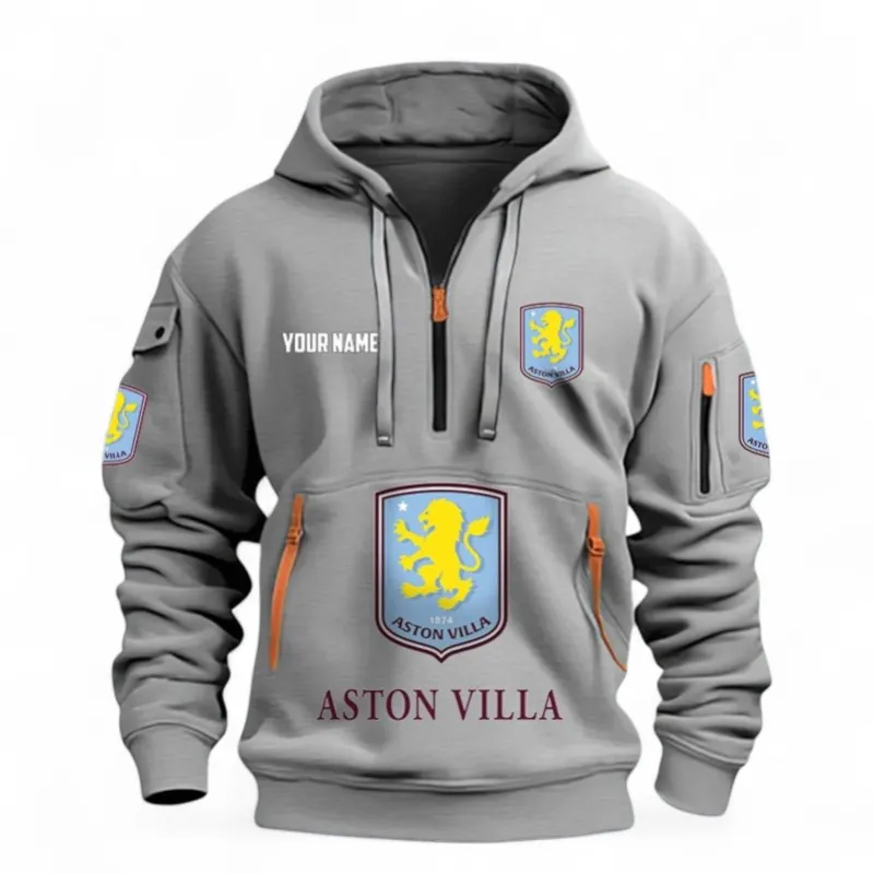 Aston Villa Fans Gift Hoodie Half Zipper, All Over Print Hoodie Half Zipper For Sport Fan, Custom Name EPL116073125005-Grey