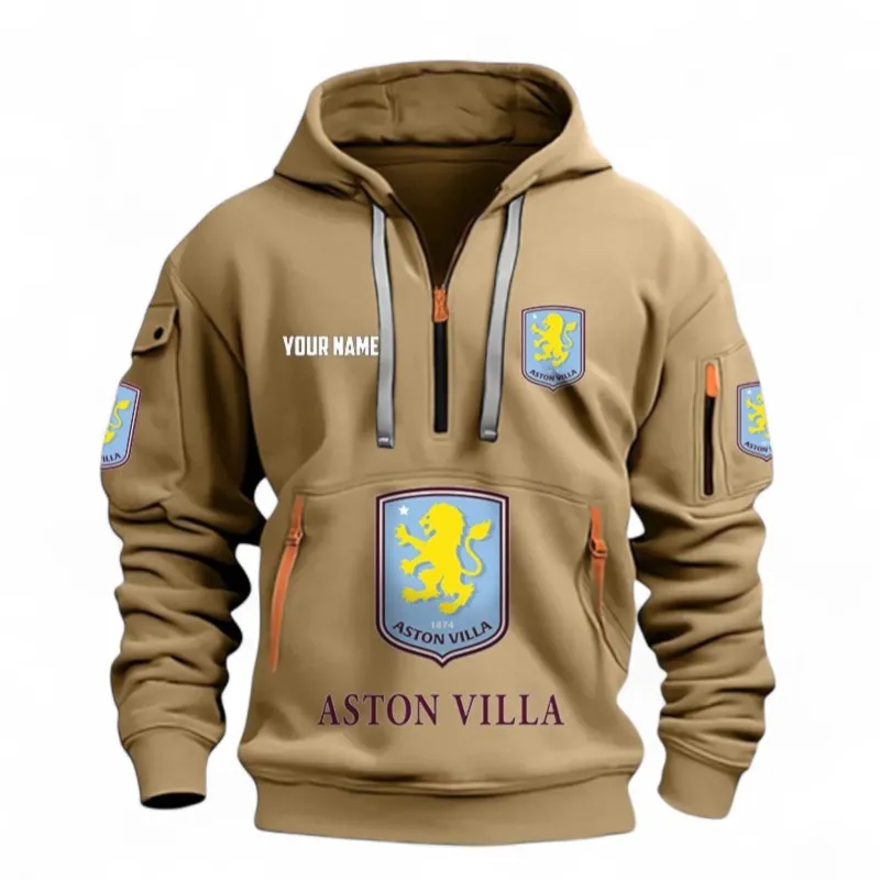 Aston Villa Fans Gift Hoodie Half Zipper, All Over Print Hoodie Half Zipper For Sport Fan, Custom Name EPL116073125005-Khaki