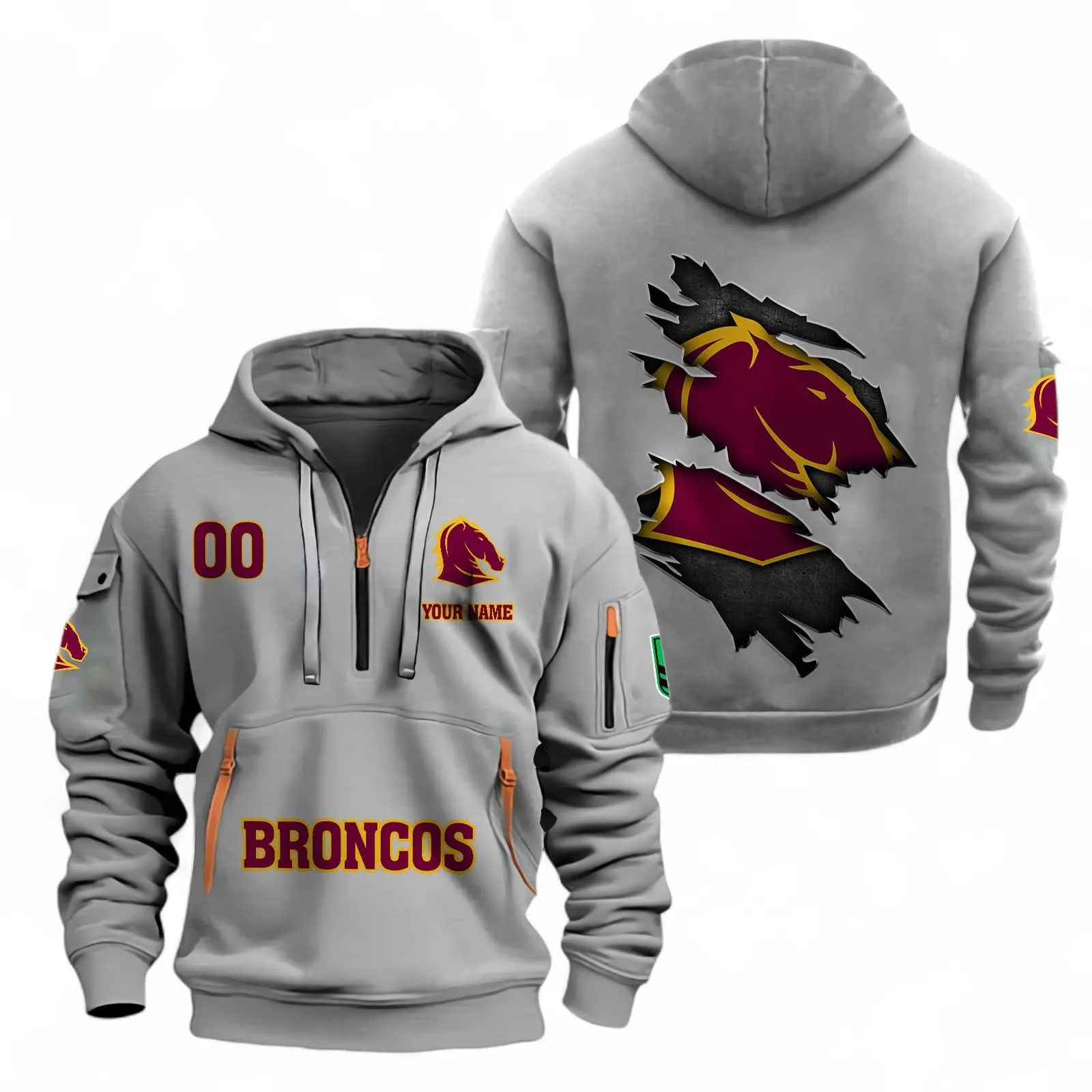 Brisbane Broncos Fans Gift Hoodie Half Zipper, All Over Print Hoodie Half Zipper For Sport Fan, Custom Name NRL170071525341-Grey