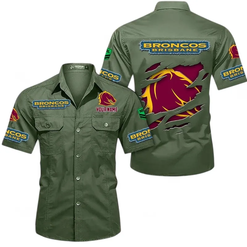 Brisbane Broncos Fans Gift Short Sleeved Shirt, All Over Print Short Sleeved Shirt For Sport Fan, Custom Name NRL172071625342-Army Green