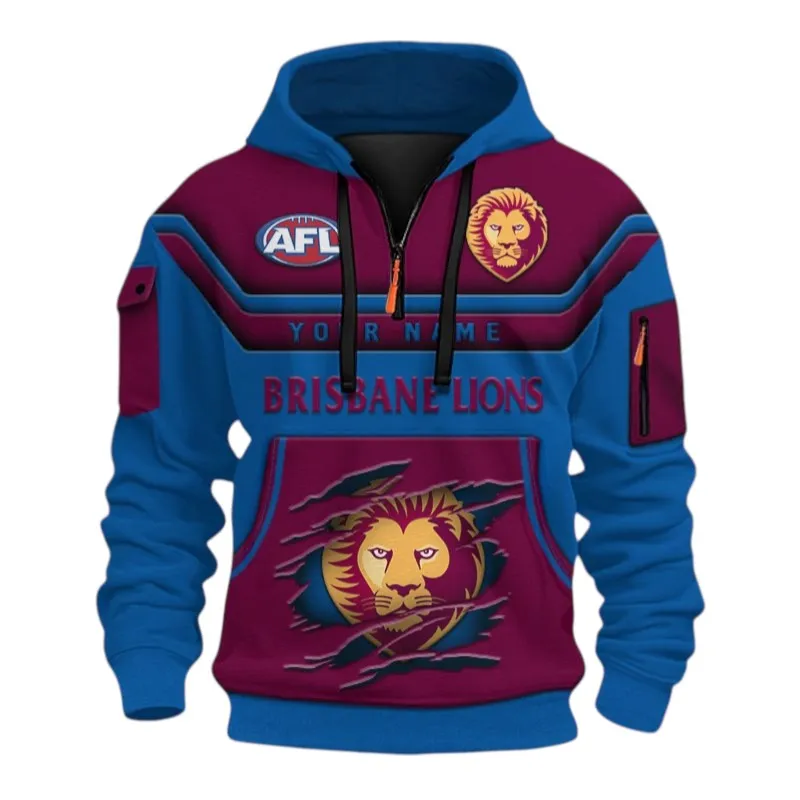 Custom Half-Zip Hoodie 3D Printed for Brisbane Lions Fans – Game-Ready Comfort Meets Personalized Power