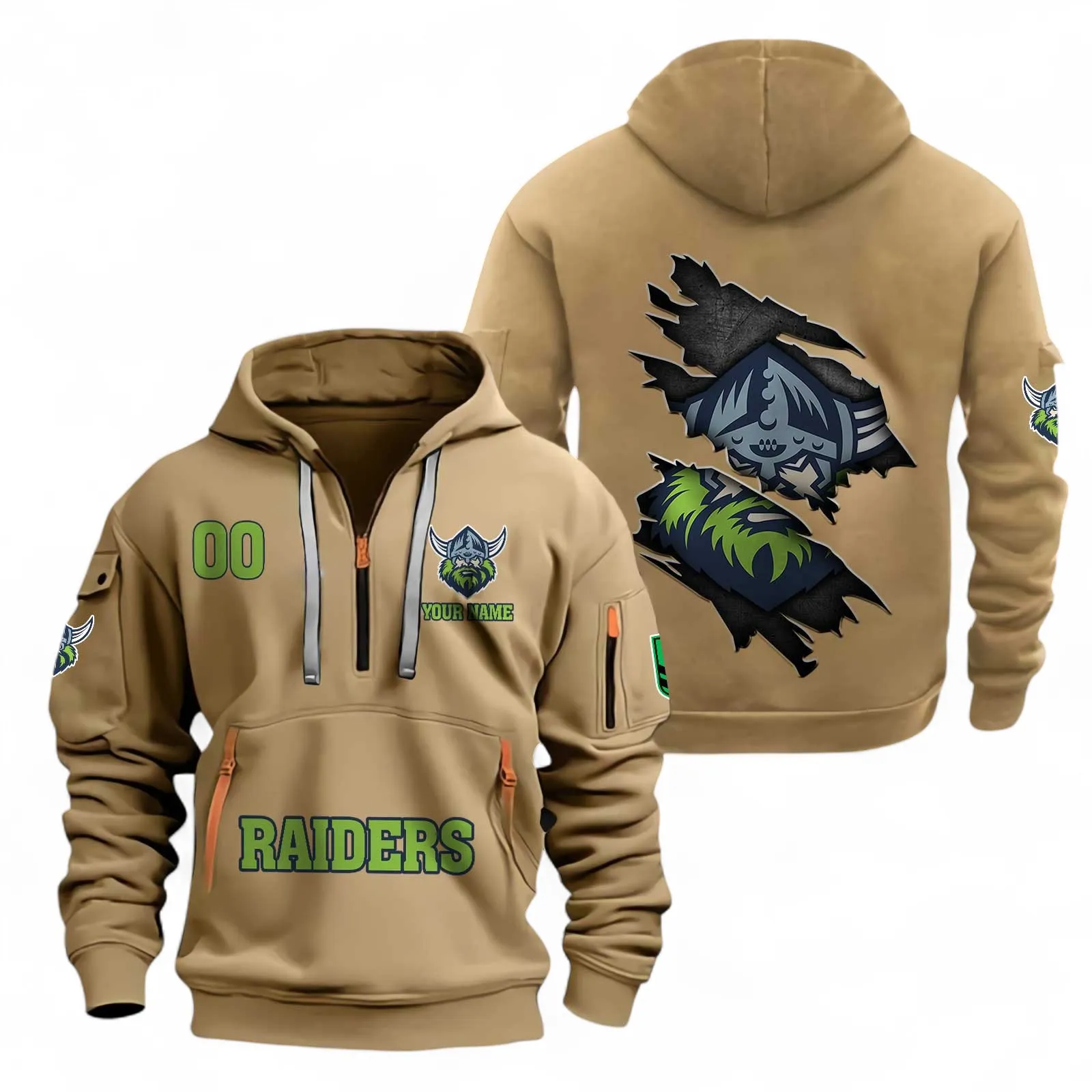 Canberra Raiders Fans Gift Hoodie Half Zipper, All Over Print Hoodie Half Zipper For Sport Fan, Custom Name NRL170071525342-Khaki