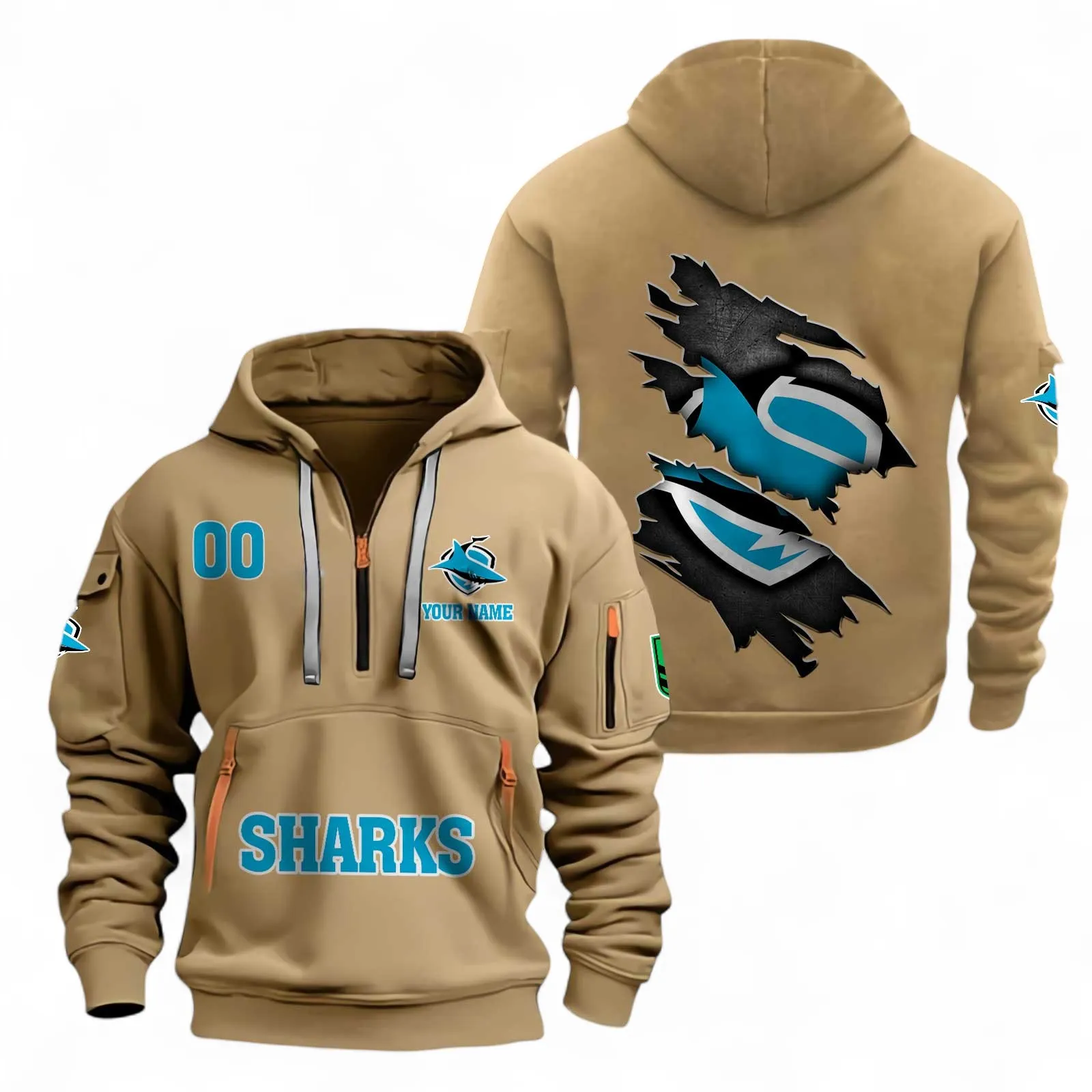 Cronulla Sharks Fans Gift Hoodie Half Zipper, All Over Print Hoodie Half Zipper For Sport Fan, Custom Name NRL170071525343-Khaki