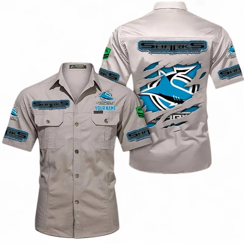 Cronulla Sharks Fans Gift Short Sleeved Shirt, All Over Print Short Sleeved Shirt For Sport Fan, Custom Name NRL172071625347-Khaki