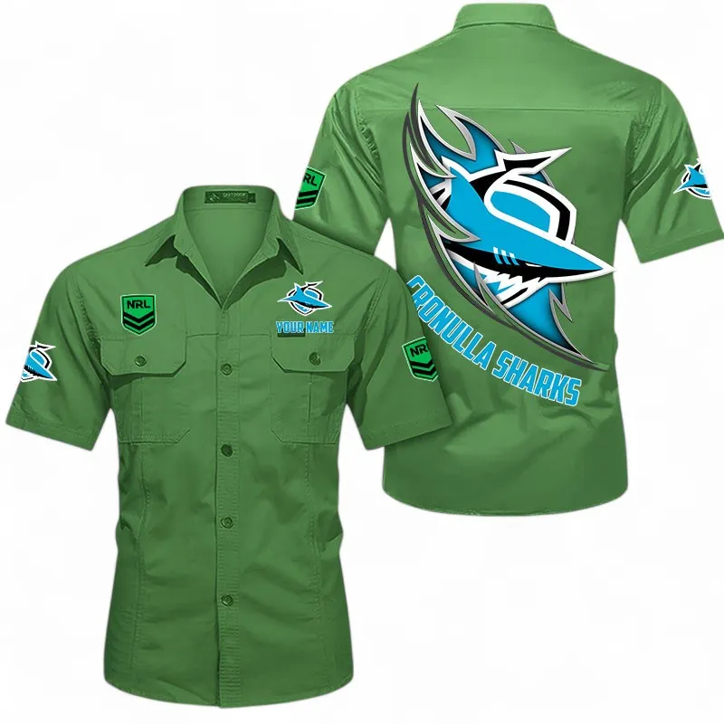 Cronulla Sharks Fans Gift Short Sleeved Shirt, All Over Print Short Sleeved Shirt For Sport Fan, Custom Name NRL173071625002-Army Green