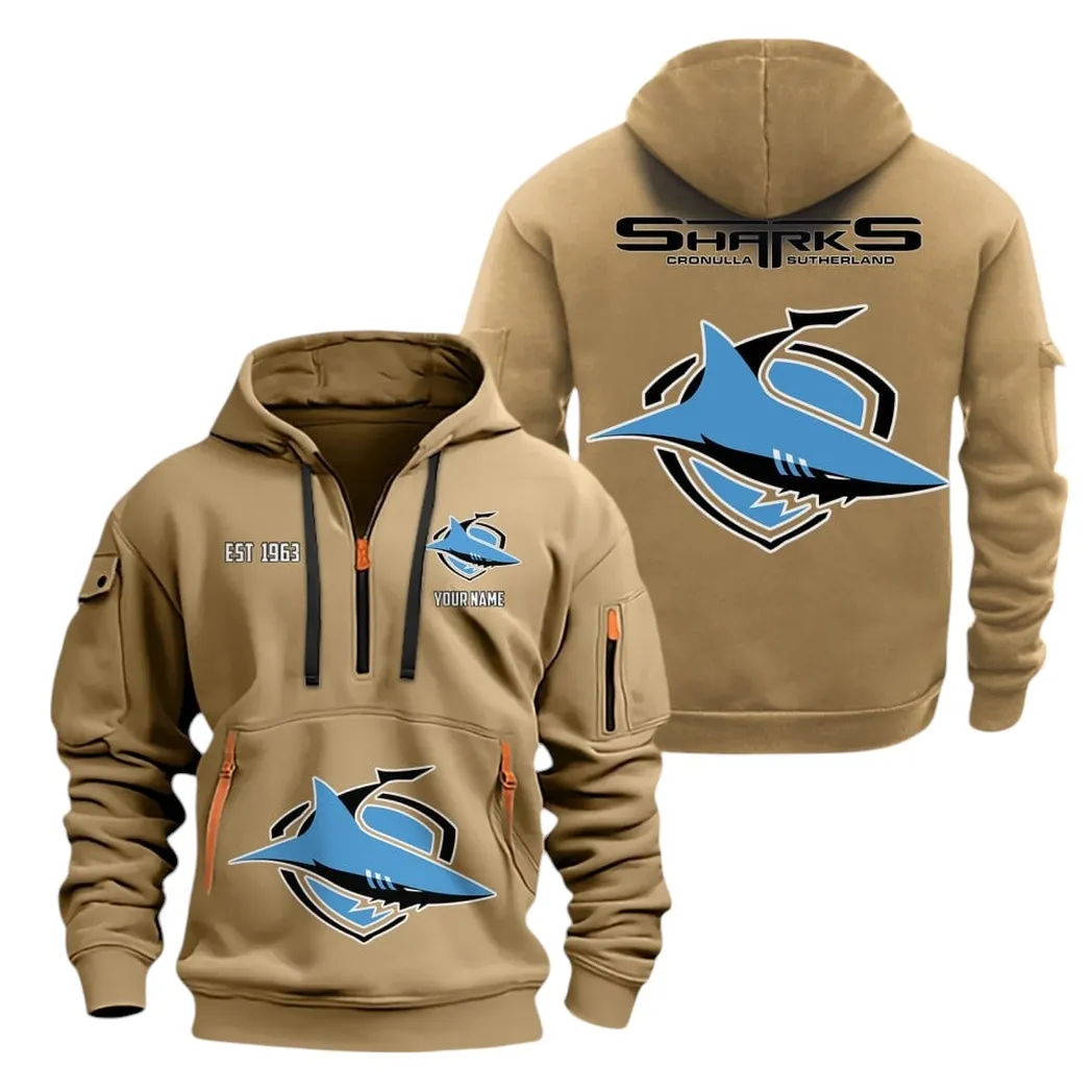 Cronulla Sharks Hoodie Half Zipper, All Over Print Hoodie Half Zipper Cronulla Sharks DNRL1356302041 - Khaki