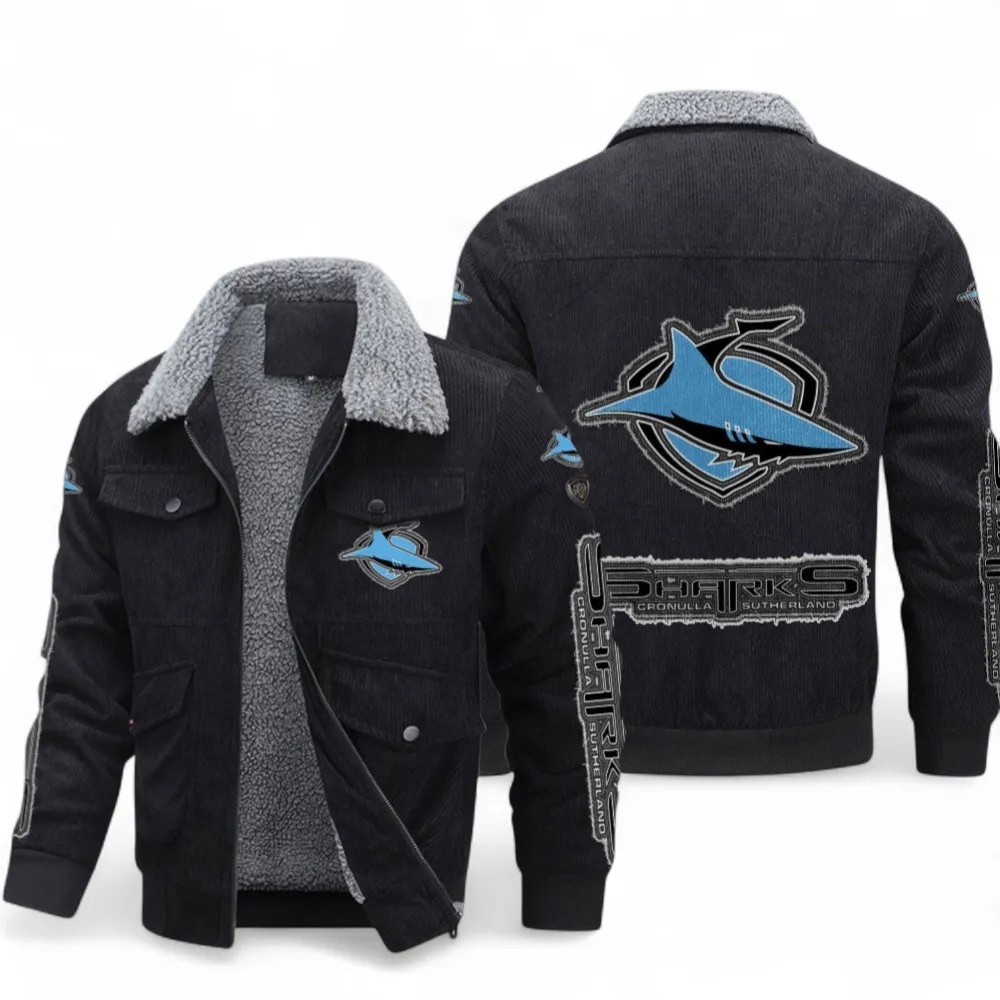Cronulla Sharks Thickened Corduroy Jacket, All Over Print Thickened Corduroy Jacket For Sport Fan NRL103072425680-Black