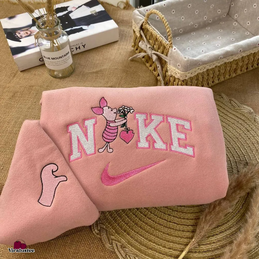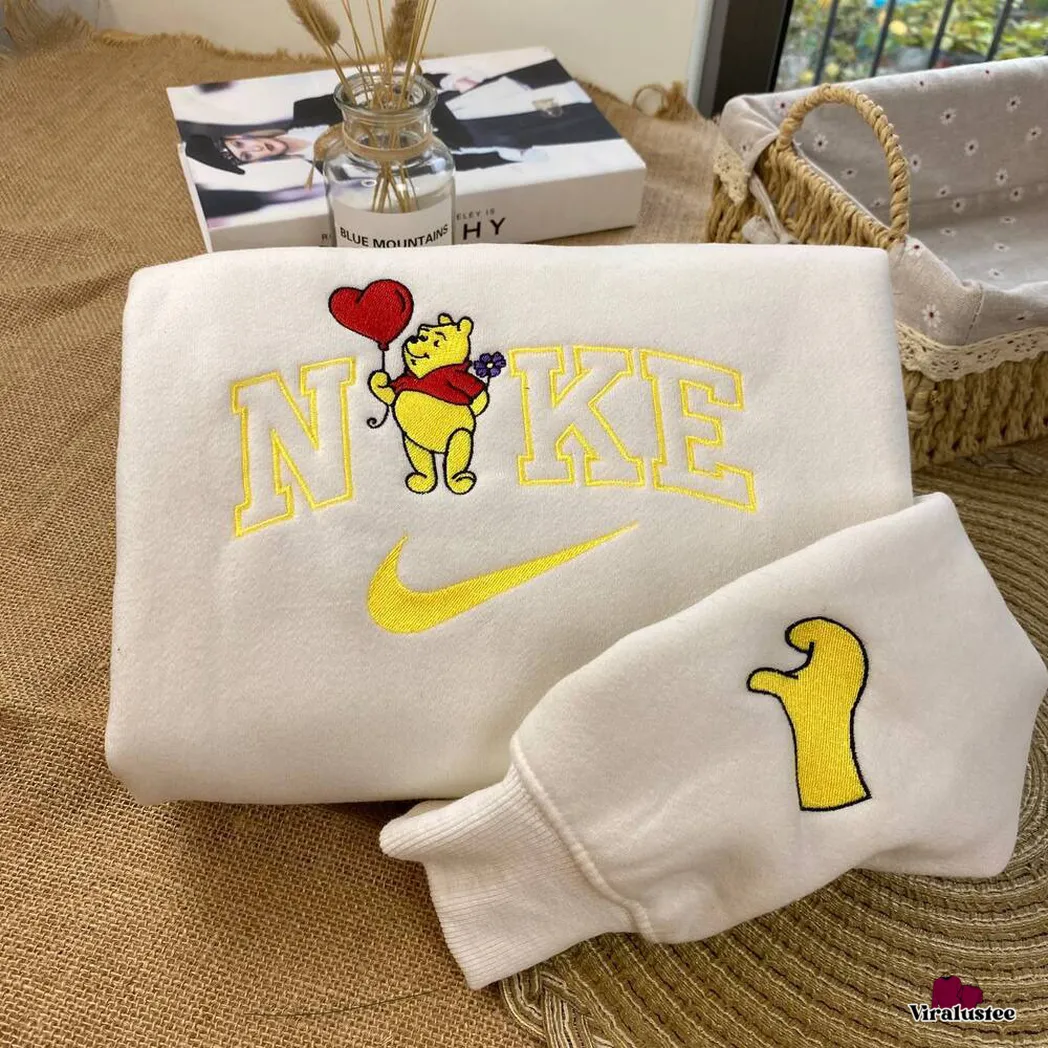Cute Pooh Bear And Piglet x Nike Embroidered Shirt, Embroidered Sweatshirt Fashion Style For Couples