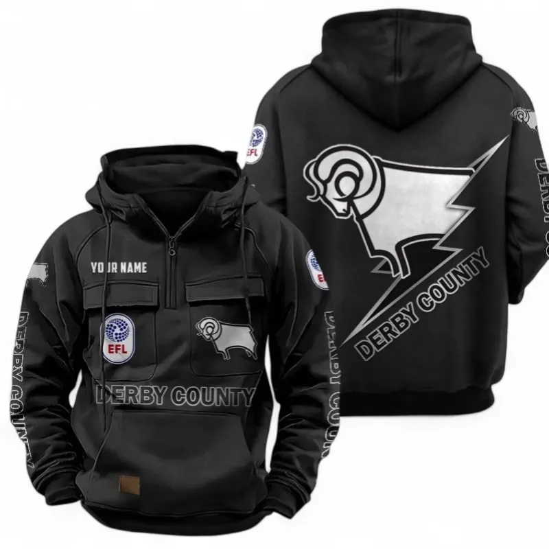 Grab your Derby County Tactical Quarter-Zip Hoodie today and show the world what real fan energy looks like.