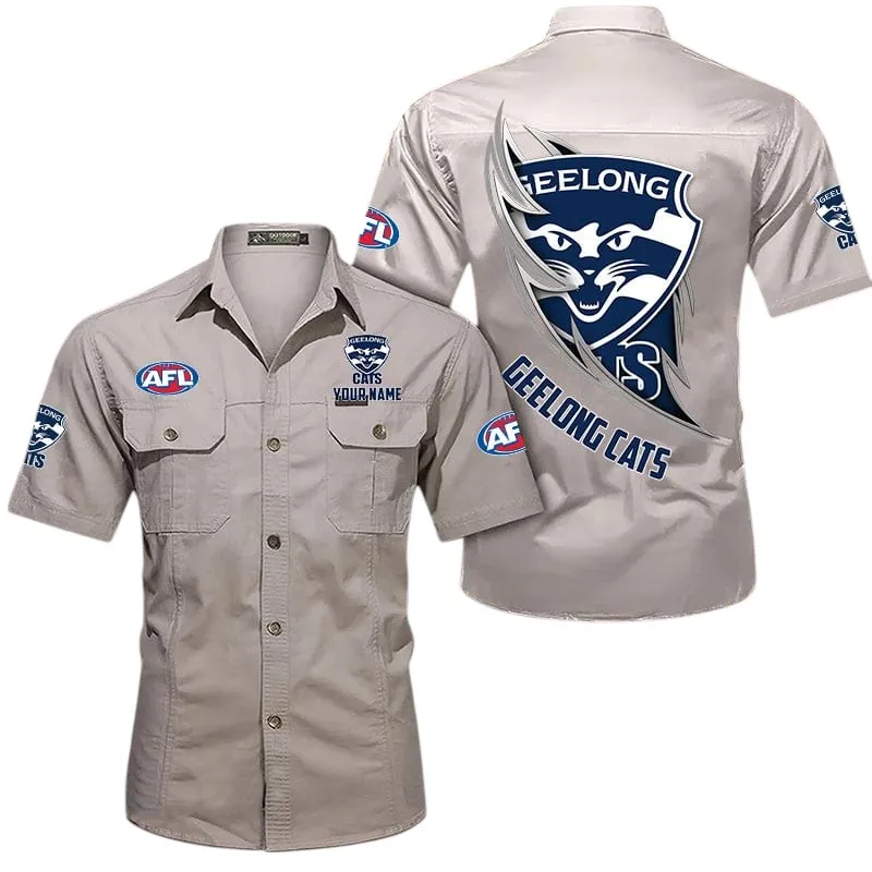 Geelong Cats Fans Gift Short Sleeved Shirt, All Over Print Shỉt For Sport Fan, Custom Name AFL155071425134 – Beige
