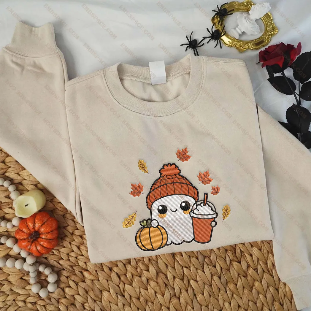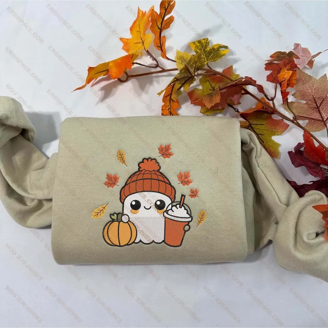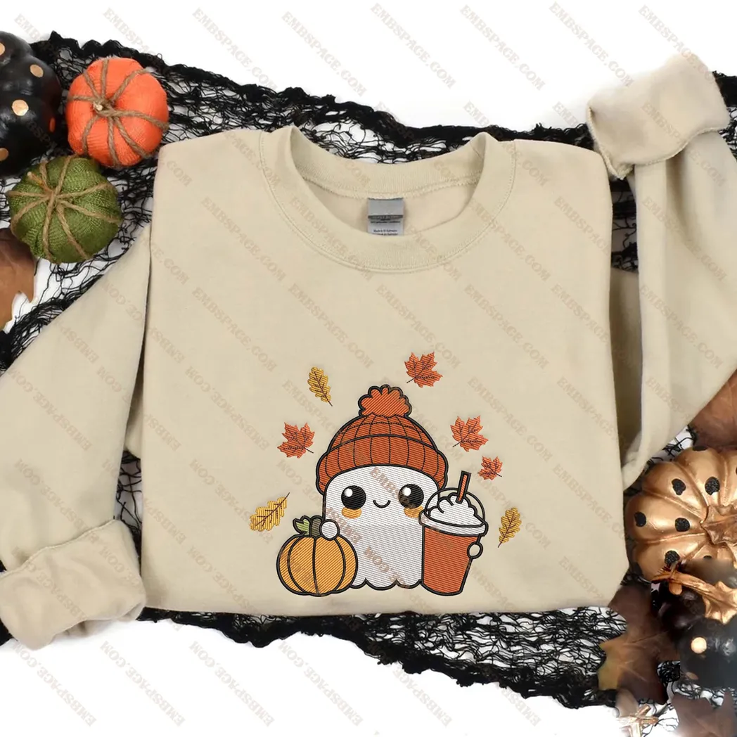 Halloween Cute Ghost Coffee Embroidered Sweatshirt Fashion Style