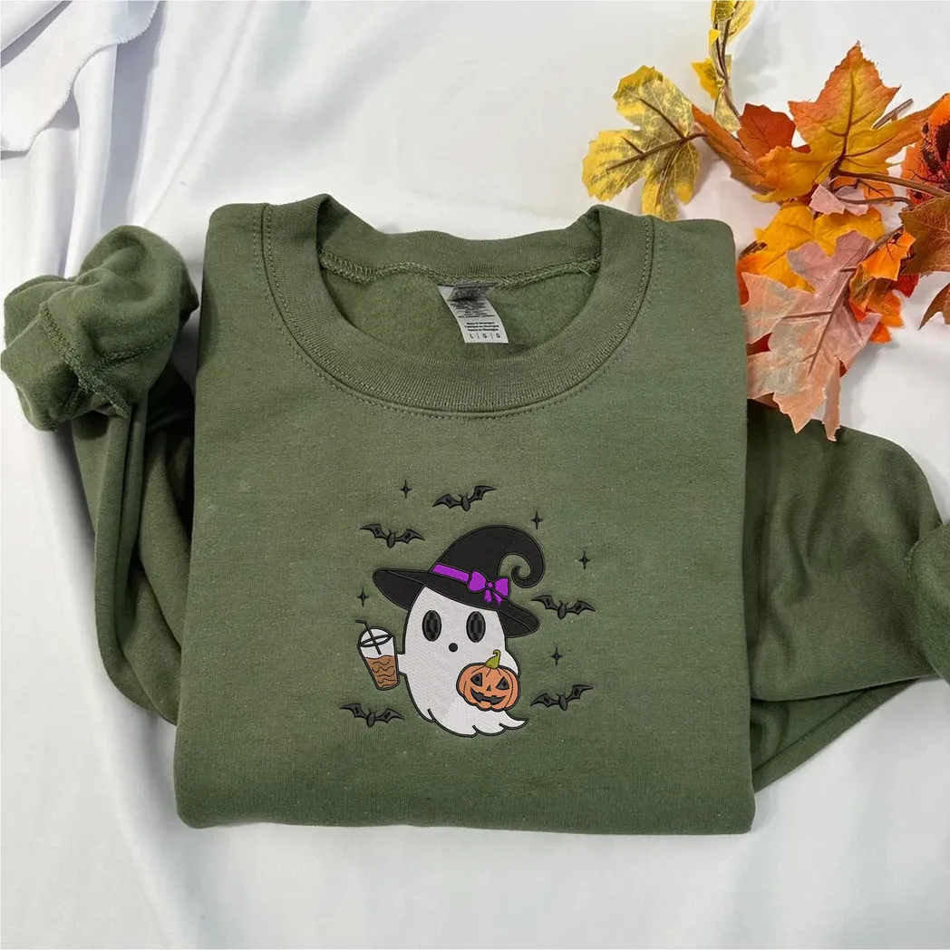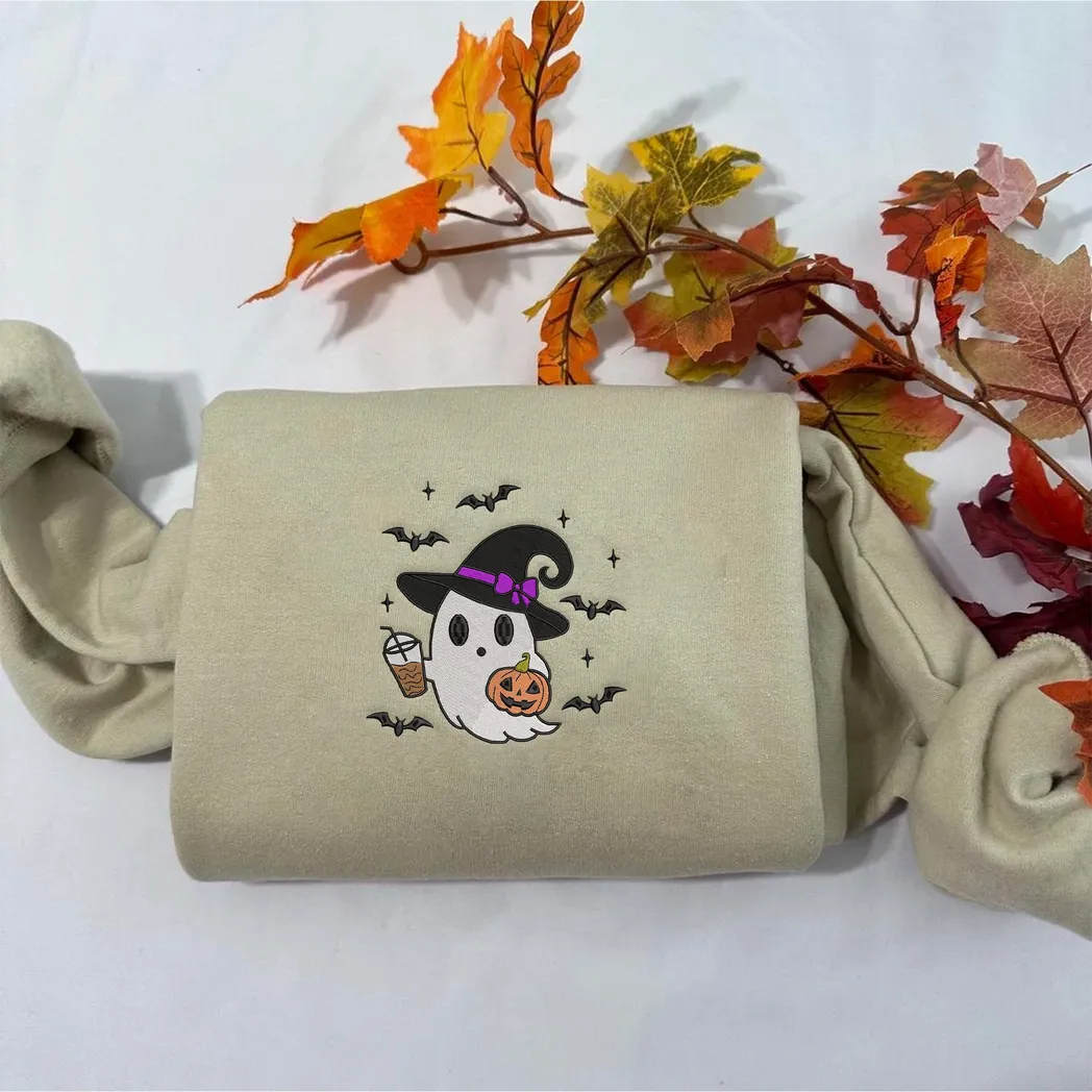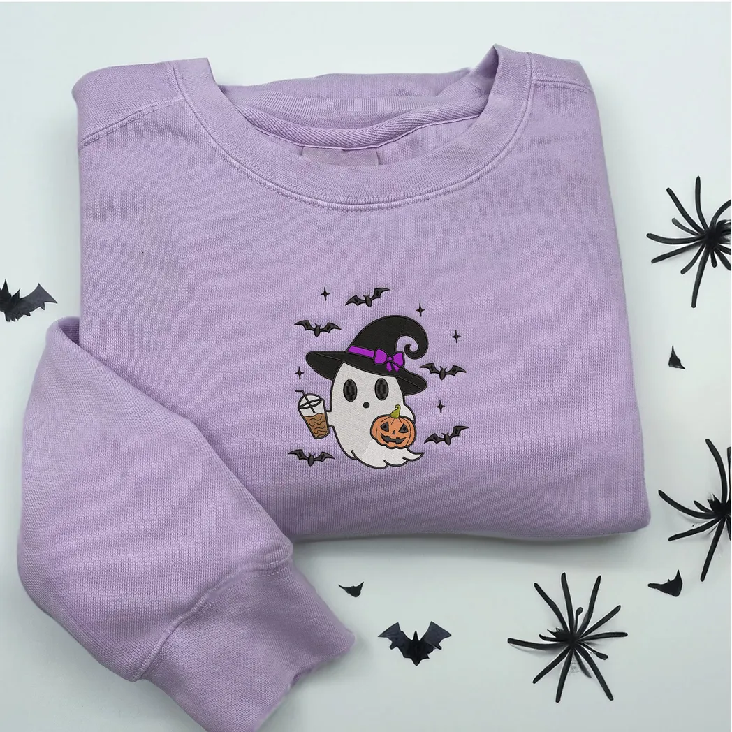 Halloween Cute Ghost DrinkEmbroidered Sweatshirt Fashion Style