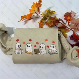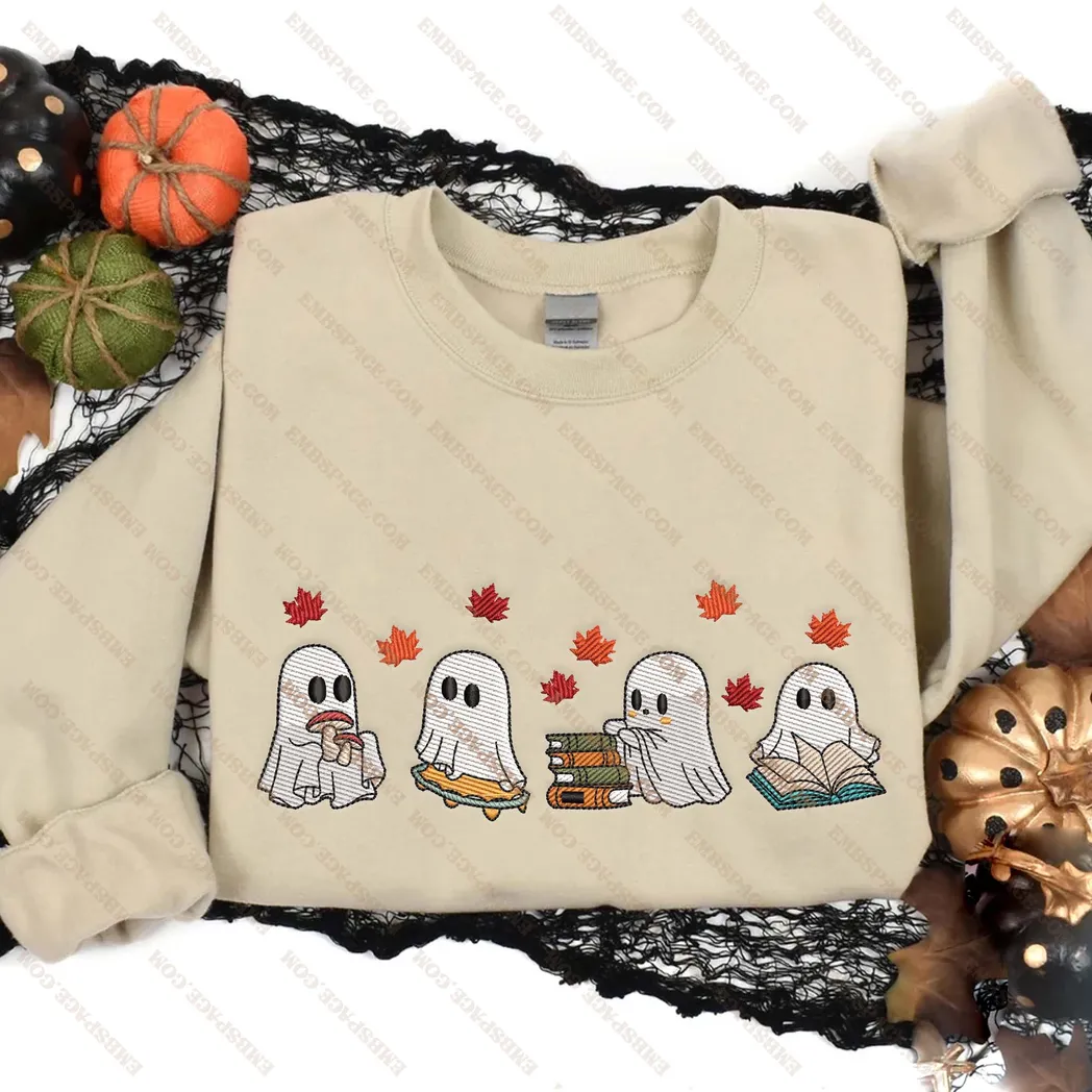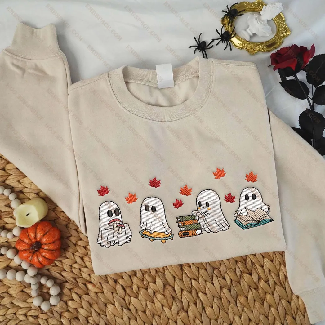 Halloween Cute Ghost Reading Books Embroidered Sweatshirt Fashion Style