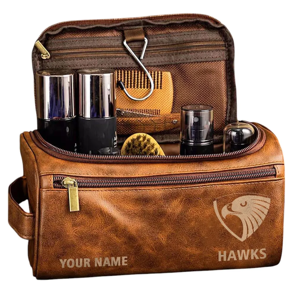 Hawthorn Fans Gift Leather Toiletry Bag, All Over Print Leather Toiletry Bag For Sport Fan, Custom Name AFL156071525124 - Dark Brown