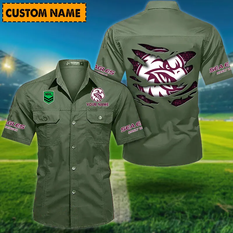 Manly Warringah Sea Eagles Fans Gift Short Sleeved Shirt, All Over Print Short Sleeved Shirt For Sport Fan, Custom Name NRL171071625557-Army Green