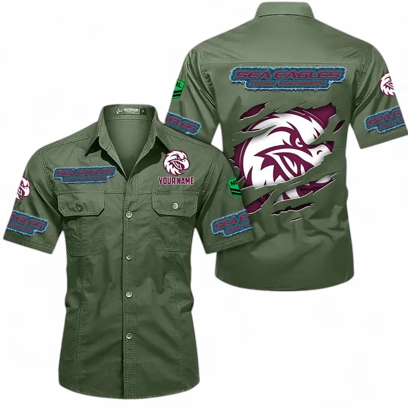 Manly Warringah Sea Eagles Fans Gift Short Sleeved Shirt, All Over Print Short Sleeved Shirt For Sport Fan, Custom Name NRL172071625337-Army Green