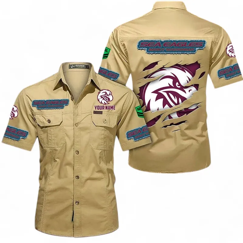 Manly Warringah Sea Eagles Fans Gift Short Sleeved Shirt, All Over Print Short Sleeved Shirt For Sport Fan, Custom Name NRL172071625337-Khaki