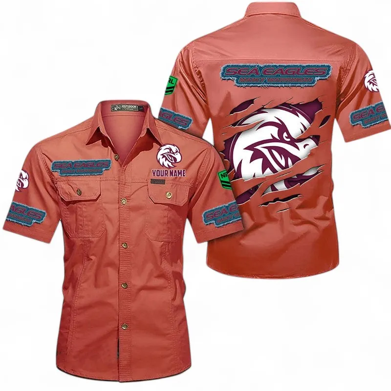 Manly Warringah Sea Eagles Fans Gift Short Sleeved Shirt, All Over Print Short Sleeved Shirt For Sport Fan, Custom Name NRL172071625337-Khaki