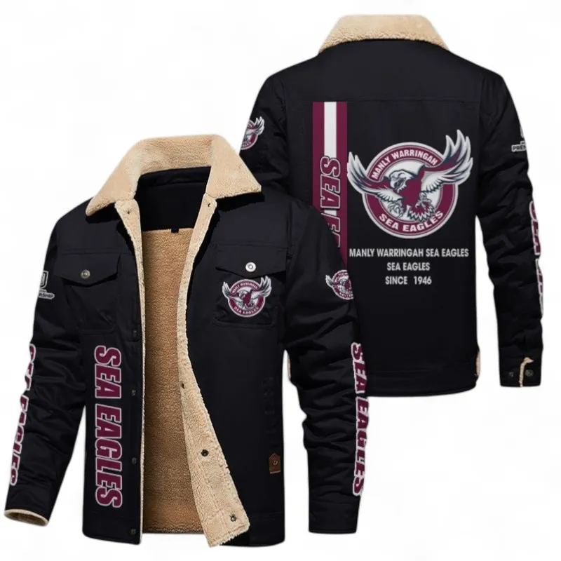 Manly Warringah Sea Eagles Jacket Fur Collar Fleece, All Over Print Jacket Fur Collar Fleece For Sport Fan NRL178072225671-Black