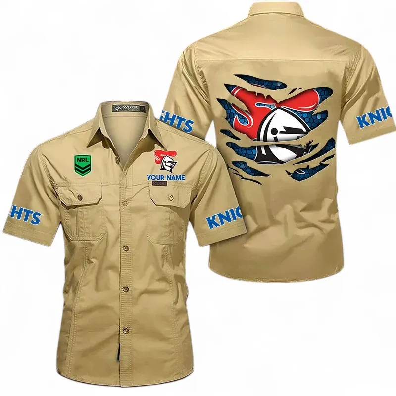 Newcastle Knights Fans Gift Short Sleeved Shirt, All Over Print Short Sleeved Shirt For Sport Fan, Custom Name NRL171071625567-Khaki