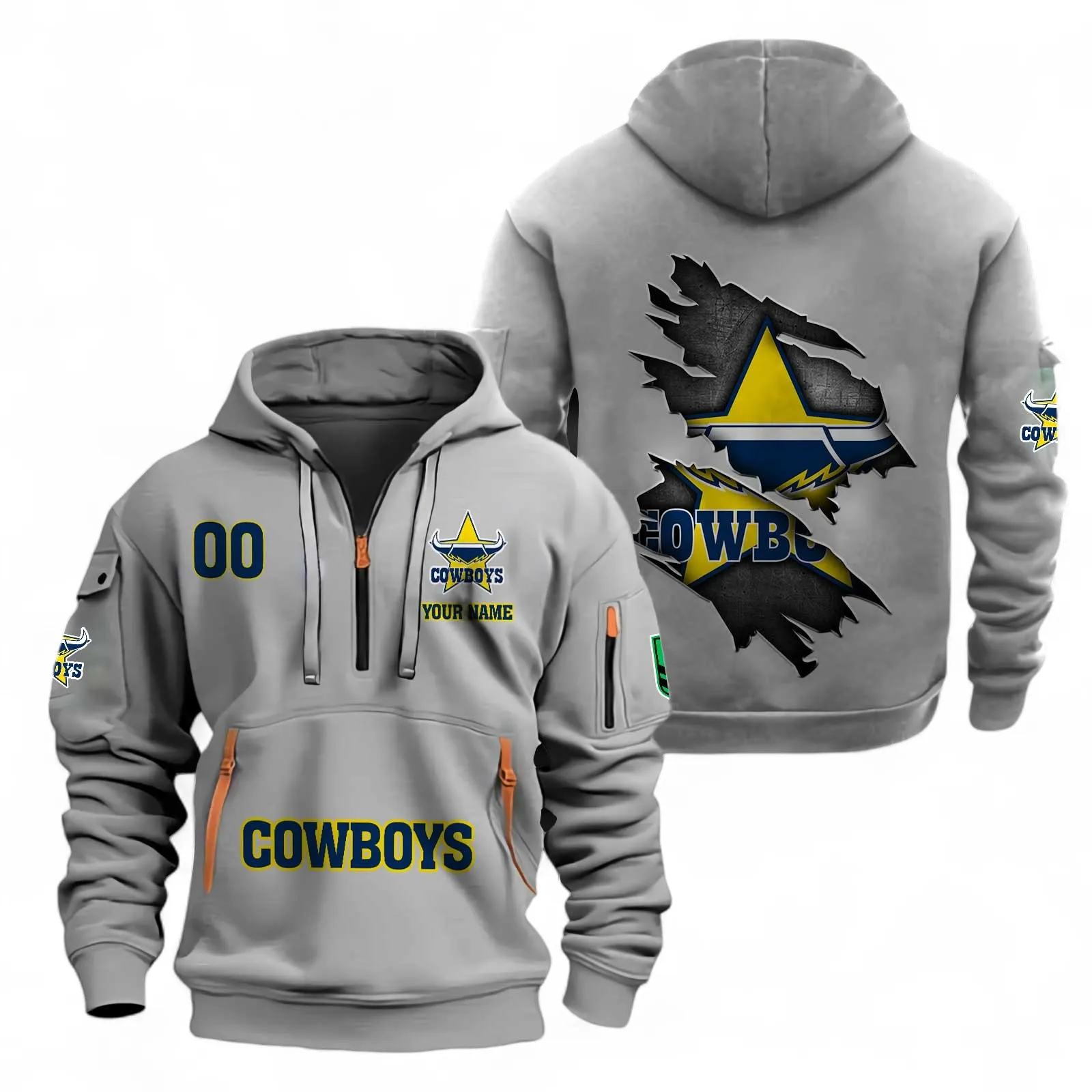 North Queensland Cowboys Fans Gift Hoodie Half Zipper, All Over Print Hoodie Half Zipper For Sport Fan, Custom Name NRL170071525344-Grey
