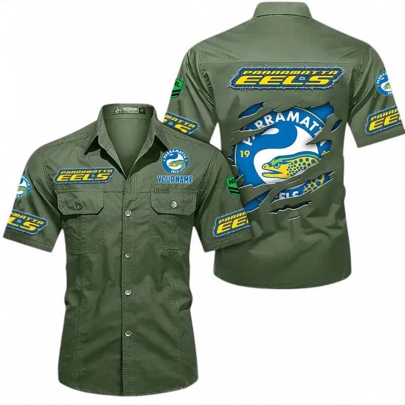 Parramatta Eels Fans Gift Short Sleeved Shirt, All Over Print Short Sleeved Shirt For Sport Fan, Custom Name NRL172071625348-Army Green