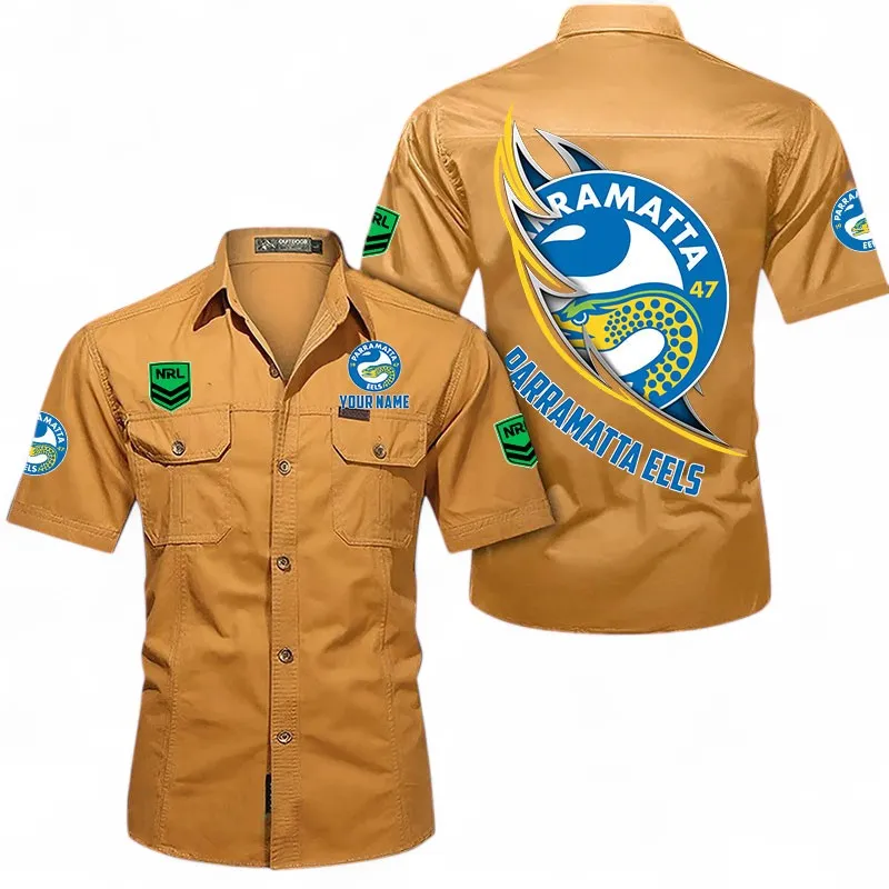 Parramatta Eels Fans Gift Short Sleeved Shirt, All Over Print Short Sleeved Shirt For Sport Fan, Custom Name NRL173071625013-Khaki