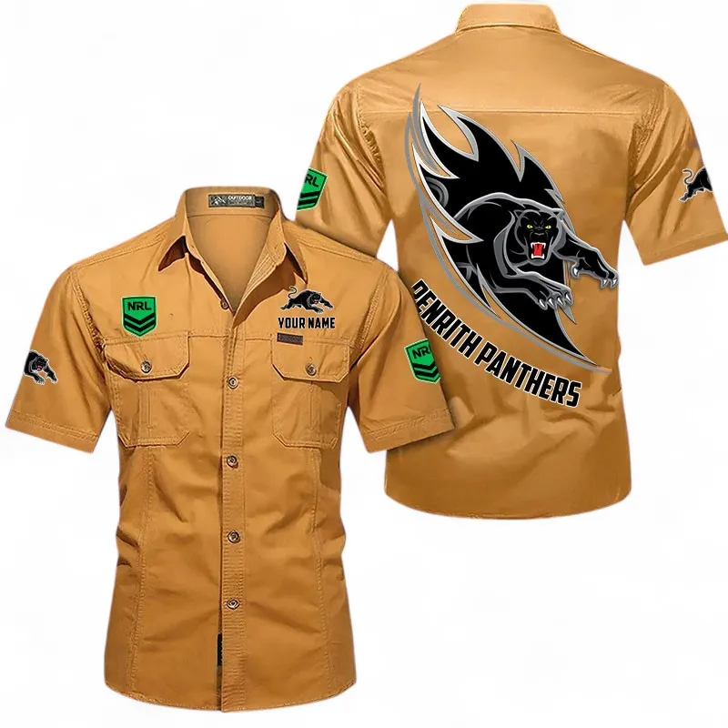 Penrith Panthers Fans Gift Short Sleeved Shirt, All Over Print Short Sleeved Shirt For Sport Fan, Custom Name NRL173071625010-Khaki