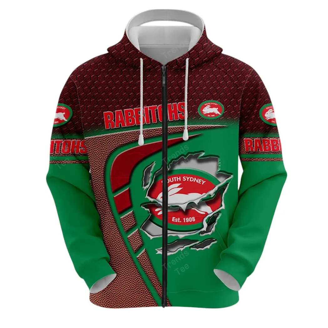 South Sydney Rabbitohs Zipper Hoodie, All Over Print Zipper Hoodie South Sydney Rabbitohs DNRL1266282029