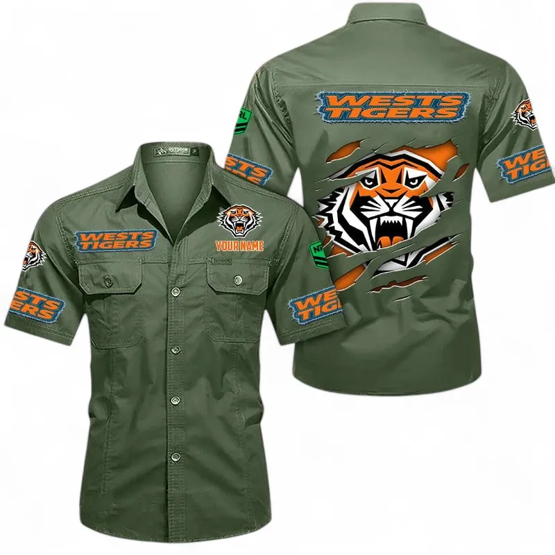 Wests Tigers Fans Gift Short Sleeved Shirt, All Over Print Short Sleeved Shirt For Sport Fan, Custom Name NRL172071625341-Army Green