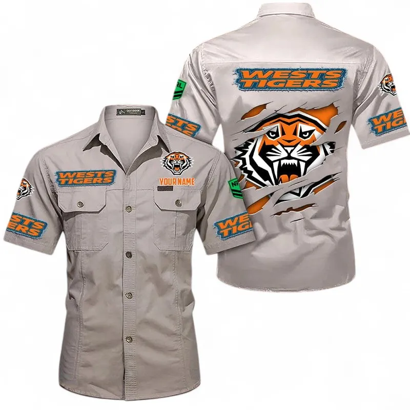 Wests Tigers Fans Gift Short Sleeved Shirt, All Over Print Short Sleeved Shirt For Sport Fan, Custom Name NRL172071625341-Khaki